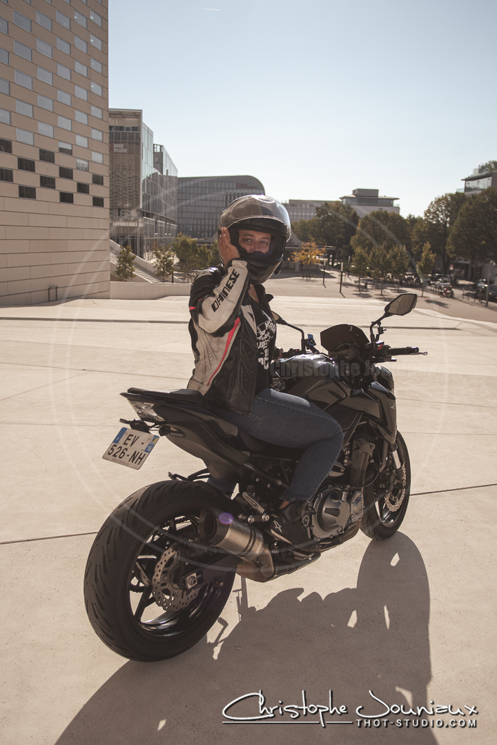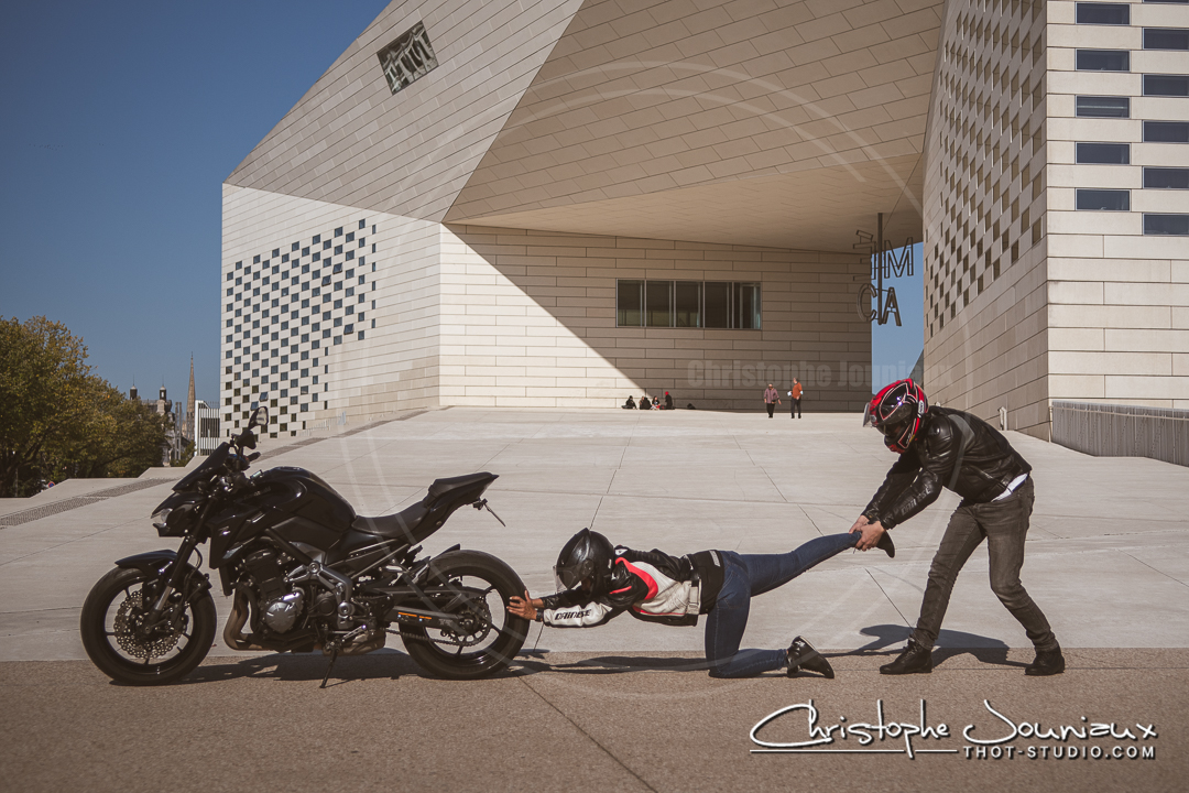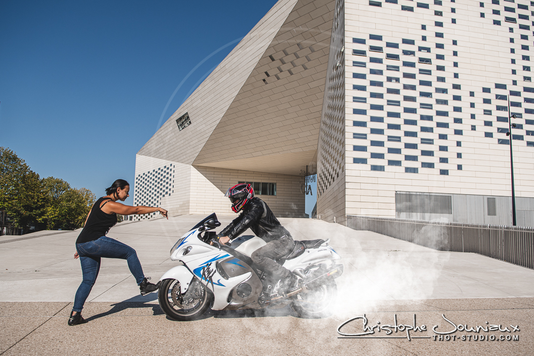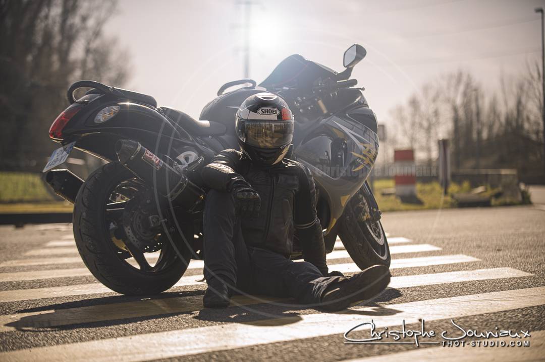 une séance photo du motard et de sa monture