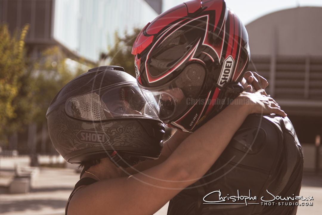 Une séance photo d'un couple de motards.