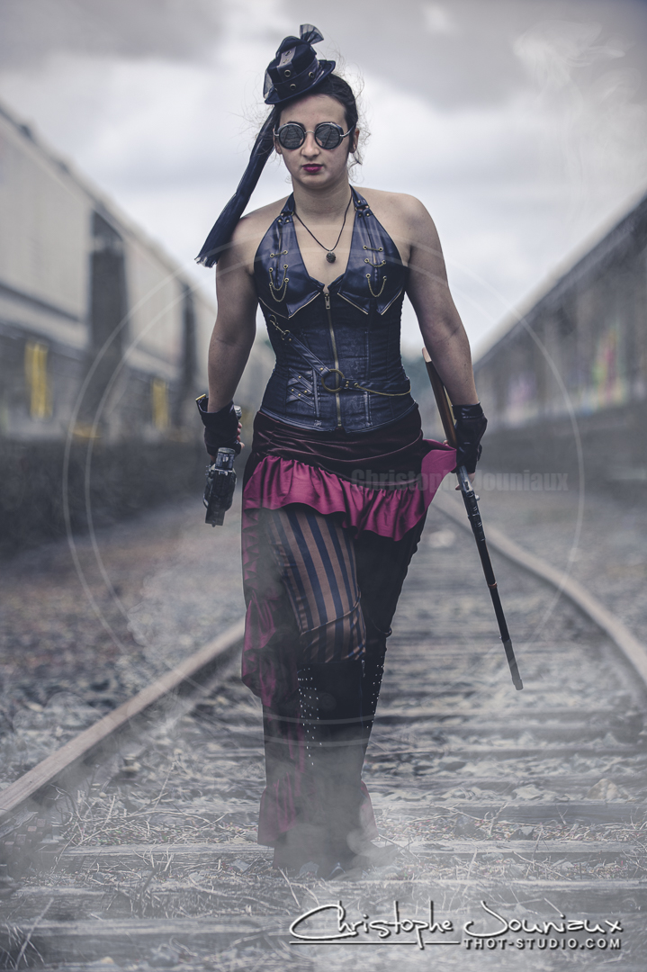 Séance photo en décor avec accessoirs et vêtements sur le thème du steampunk